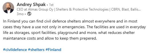 Krásna ukážka toho, ako funguje civilná ochrana vo Fínsku a ako by mala fungovať všade. Vo Fínsku nájdete kryty civilnej ochrany skoro všade a vo väčšine prípadov majú aj svoje mimo krízové využitie, tak, ako by to malo byť. Sú to rôzne sklady, športoviská, ihriská, parkoviská a mnoho iného.